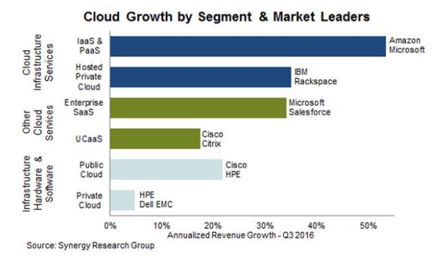 Entre le quatrième trimestre 2015 et le troisième trimestre 2016, les dépenses dans le logiciel et le matériel pour bénéficier d’infrastructures cloud a dépassé 65 milliards de dollars. La moitié a été investi dans le nuage privé, mais sa forme publique grossit bien plus rapidement. Les fournisseurs de services qui se sont équipés de manières adéquates ont pu générer 30 milliards de dollars de chiffre d’affaires à travers les différents services vendus : IaaS, PaaS, et hébergement de services de nuage informatique privé. Le SaaS pour les entreprises leur a permis de gagner 40 milliards de dollars tout en améliorant des plateformes de réseaux sociaux, l’emailing et le e-commerce.